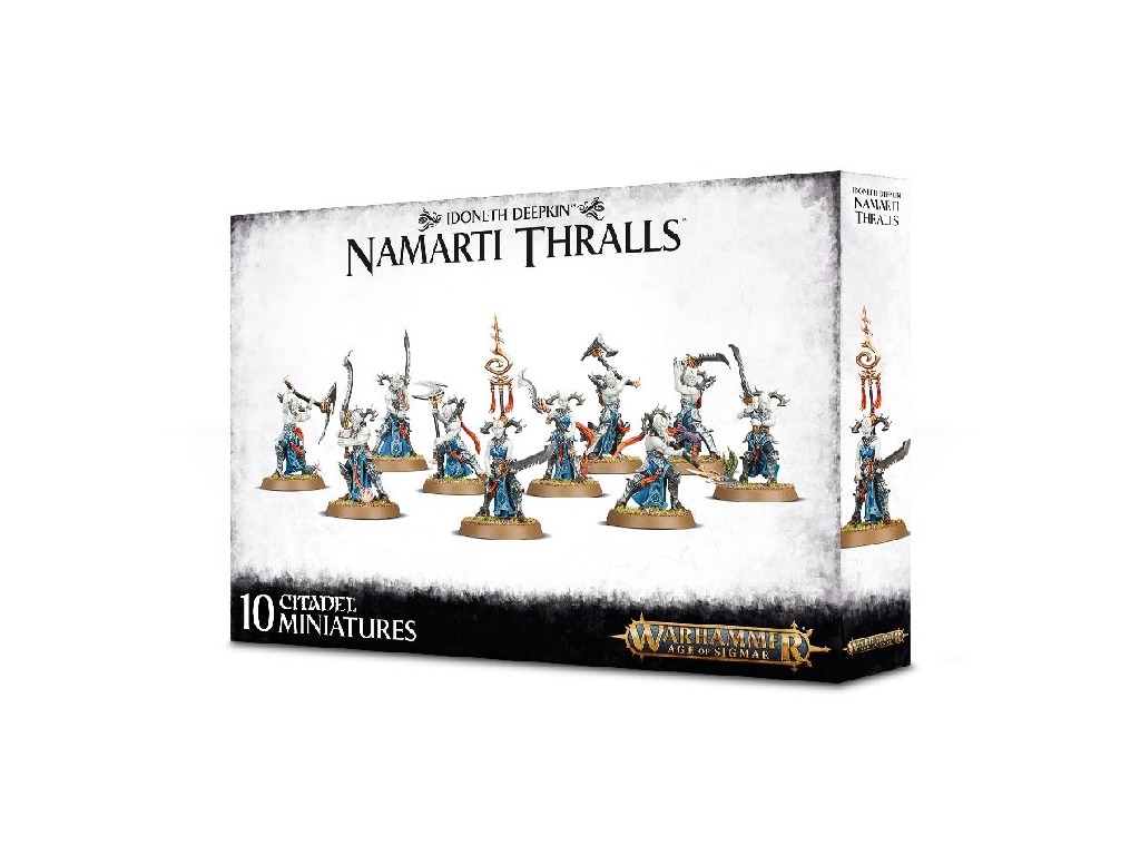 This multi-part plastic kit contains the components necessary to assemble 10 Namarti Thralls. Clad in less-ornate armour than their commanders and superiors, as befits their withering souls and disposable nature, they still cut impressive figures – each is powerful and muscular. There are 11 heads in the kit, which can be placed on whichever models you wish; each is hairless and blind, with blank, empty sockets where eyes should be. 10 elaborate neck crests are included, which curve upward and behind their heads, giving the impression of spiked horns. There’s plenty of choice in their weapons – each wields a two-handed lanmari, as follows: 4 can take a choice of glaive or sword, 3 have a choice of axe or sword, 2 carry swords and 1 carries an axe. There is an option for an icon bearer – they have a specific head, and a large mathlann slave rune which forms part of their neck crest. As an added bit of detail the kit comes with 6 pieces of scenery and fish for the bases, which can be added to any model you like..