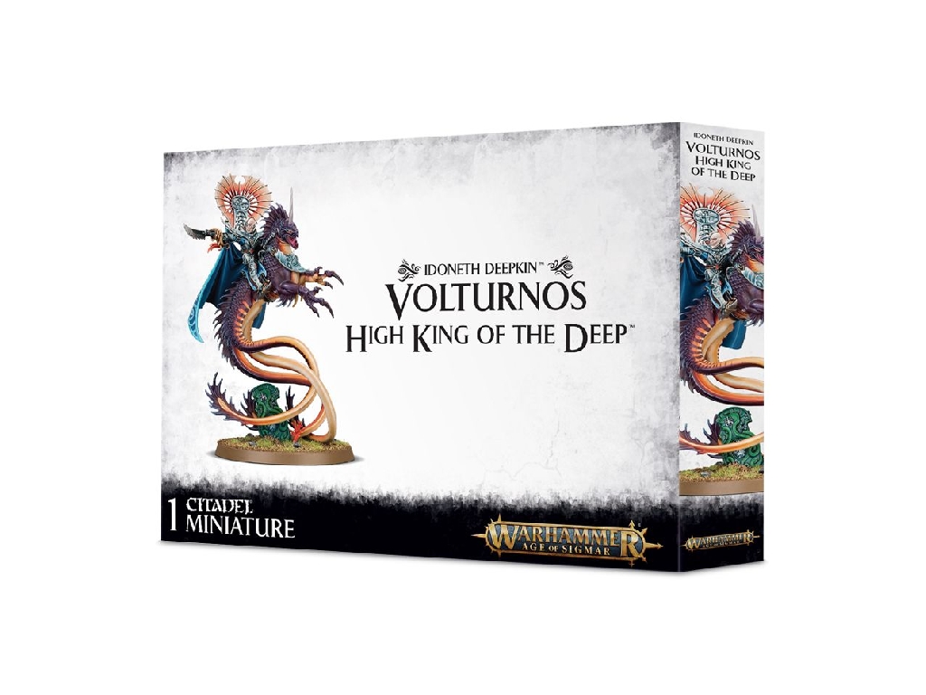 This multi-part plastic kit contains the components necessary to assemble Volturnus, High King of the Deep. Very much prepared for war, he wears splendid, heavy plate armour – of particular note are the leg and shoulder coverings, which extend far further than his actual shoulders, providing support for the enormous, wide cloak which billows outward and downward, featuring Idoneth symbols at the edges. In his gauntleted right hand he holds the Astra Solus, a wicked-looking serrated blade, and in the left hefts Cealith, the High King’s shield. Above his shaved head (complete with eyepatch!) is the Crest of the High Kings – a tall, majestic banner with carved metal Idoneth symbols and a large jewel featuring prominently. His mount, Uasall, is a Deepmare of renown – a massive, scaled creature whose forelegs end in huge talons and whose rear half splits into 3 powerful tails, distinguishable from other Deepmares by his larger piercing horn. An aelven waystone is included as an atmospheric piece of detail for the base.