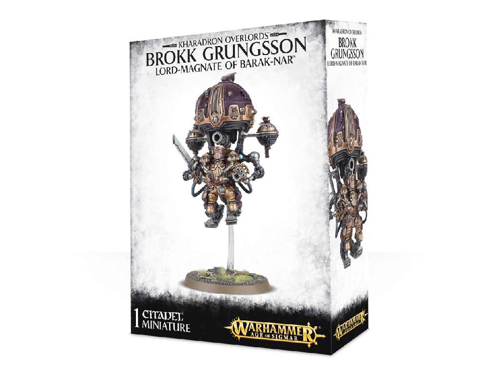 Multi-part plastic kit. He’s armed with a sizable cannon known as Grungsson’s Boast, a multi-barrelled gun called the Magnate’s Charter and an aethermatic saw for close combat. This model comprises 46 components, and is supplied with a Citadel 50mm Round base, with a 35mm ball and socket flying stem.