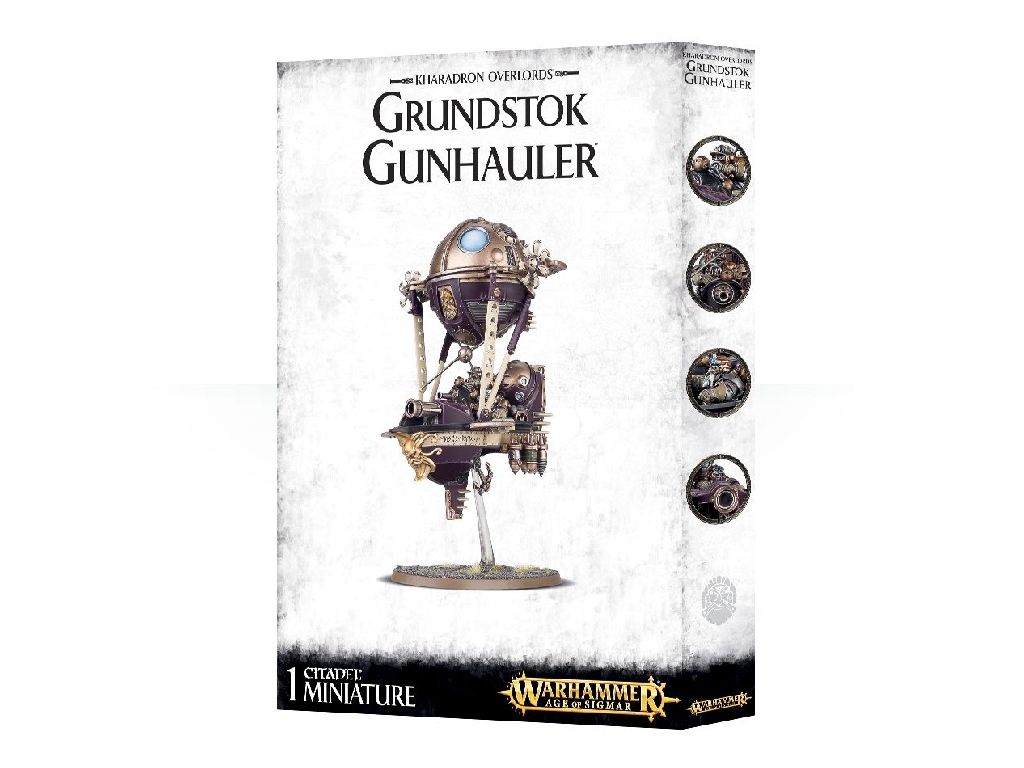 This multi-part plastic kit contains the components necessary to assemble a Grundstok Gunhauler. Small and agile, it features as a main armament a choice of sky cannon or drill cannon. Two duardin crew the Gunhauler: a pilot who stands at a large rack of arcane instruments, and a gunner who controls the aethershot carbine, fragmentations charges, detonation drills and belaying valves used to gently dissuade enemies from getting too close to the main fleet.