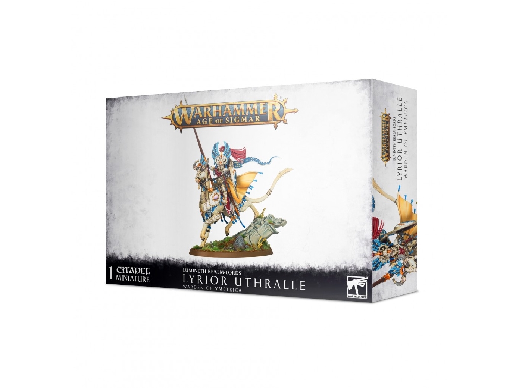 Mounted upon Farael, his nimble lightcourser steed, the Warden of Ymetrica darts across the battlefield spearing foes and hurling beams of searing light with his lance, Daemonbane. He is also a commander of unsurpassed skill among the Lumineth, making him a perfect choice to lead your forces into battle.
