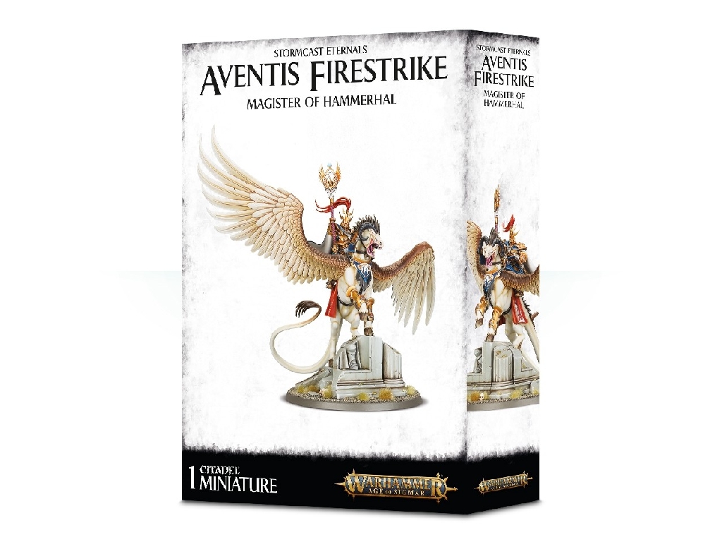 Just as the lightning shatters the oak to leave a pillar of flame in its wake, Aventis Firestrike is not only the stormbolt, but its burning aftermath, His power over the magic of the realms comes from a glowing coal of anger deep within his chest, which his many acolytes say is the source of his famously foul temper. When the Shyish necroquake cascased across reality he convinced his kindred spirit, the Tauralon Loithar, to return with him to his homeland; since then Aventis has won such acclaim that Sigmar has sworn him the Magister of Hammerhal.