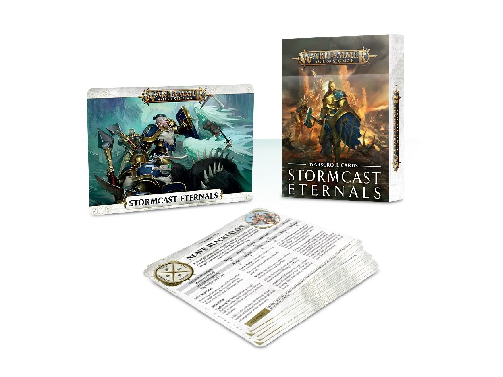This pack of 53 large-format cards contains each of the unit Warscrolls from Battletome: Stormcast Eternals – including 3 Endless Spell Warscrolls – printed on individual cards for handy reference in your battles, along with 2 sheets of gaming tokens. These include Command Point and Battle Trait tokens, 3 spell tokens from the Lore of Invigoration, 3 spell tokens from the Lore of the Storms, and a set of Objective tokens.