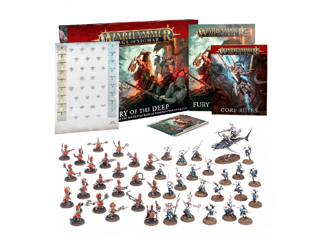 The Fury of the Deep booklet outlines the narrative of the battle for Ryftmar in Aqshy, where the Idoneth Deepkin rise from the Vitriol Sea to reap the souls of the furious Fyreslayers. Learn more about the Realm of Fire, and discover a new spell, a Realm Command, Realmscape Features, and three new battleplans to be used in open and narrative play.