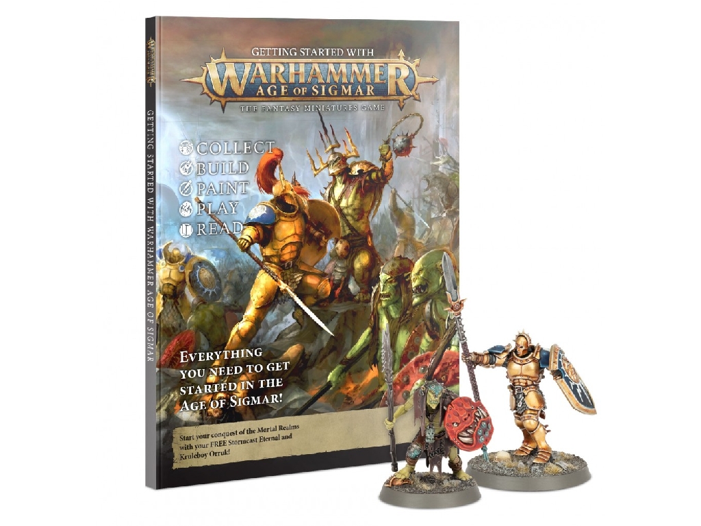 112 oldalas bevezető kiadvány Warhammer Age of Sigmar játékhoz, ingyenes Stormcast Eternal’s Vindictor és Orruk Warclan’s Kruleboyz Gutrippa figurával.