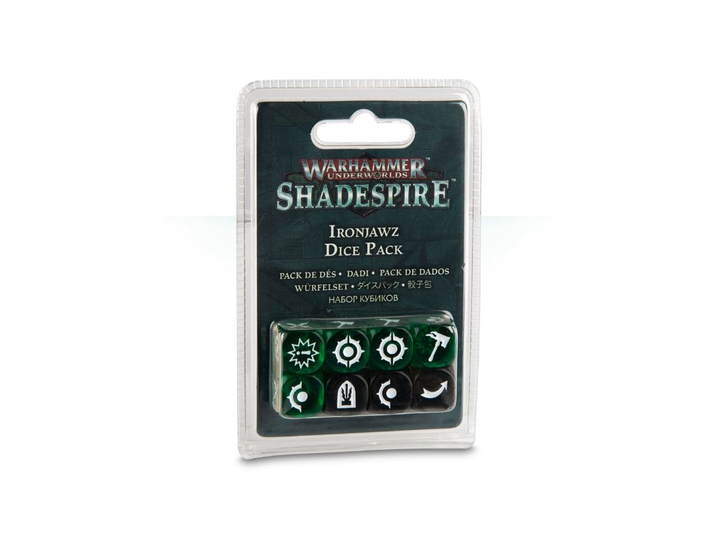 This is a set of Ironjawz-themed dice for use with Warhammer Underworlds: Shadespire. It contains 8 six-sided dice - 5 green Attack dice and 3 grey Defense dice, with the apppropriate symbols on each. Pick up a set for spares - you can never have too many!