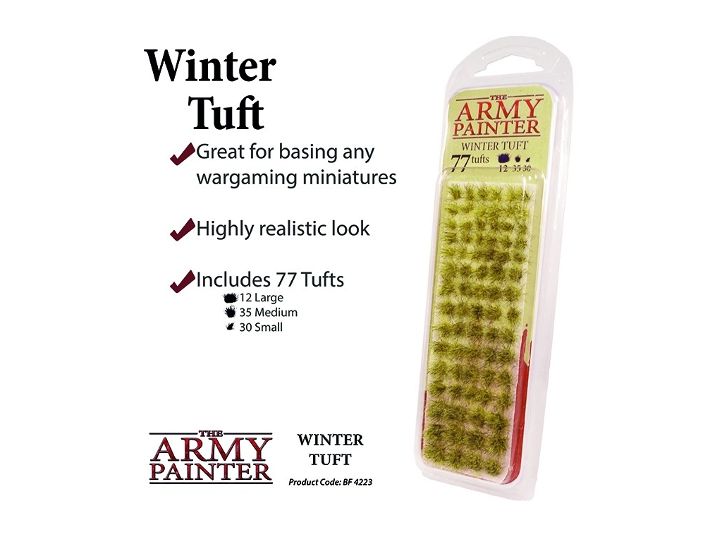 Winter Tufts are created to resemble bleached/dead grass during very cold months. It looks particularly well with Snow Flock (coming soon) added to the base as well, giving the perfect illusion of a frosted battlefield. Try experimenting with combining Winter Tuft and Highland Tuft for Autumn seasons.
