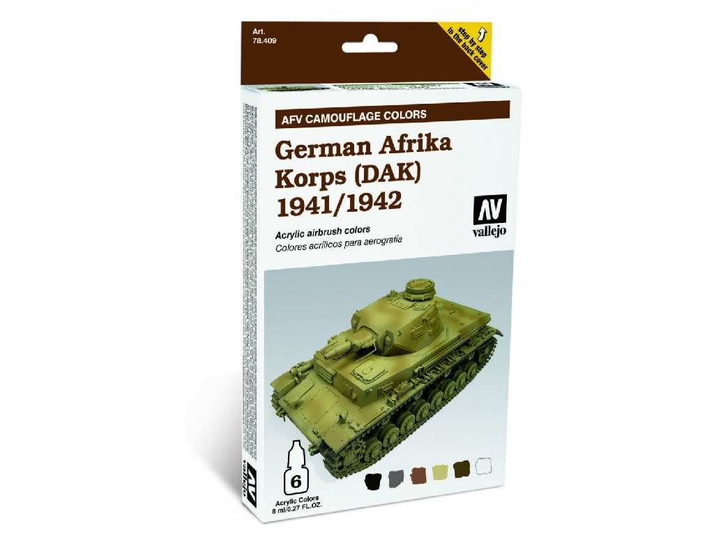 The set contains 6 Model Air colors in 8 ml. for the early DAK vehicles of the Afrika Korps, with step by step instructions and photographs by Chema Cabrero.