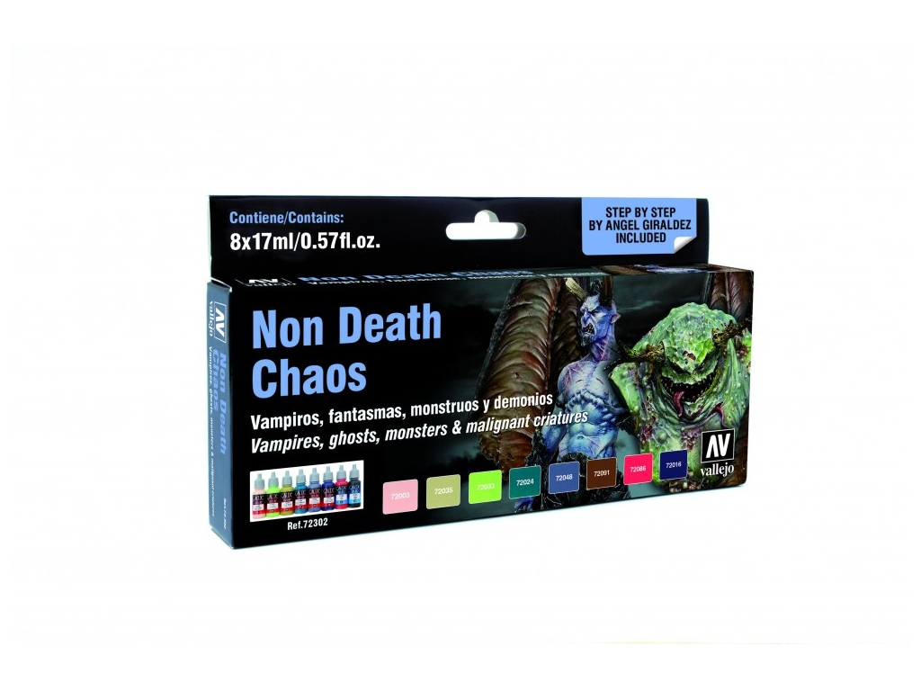 A Non Death Chaos szett 8 db színt tartalmaz, Ángel Giráldez, lépésről lépésre történő festési utasításait az éjszaka kísérteteinek, zombiknak, szörnyeinek, vámpírjainak, démonainak és egyéb rosszindulatú lényeinek miniatűr figuráinak festésére.