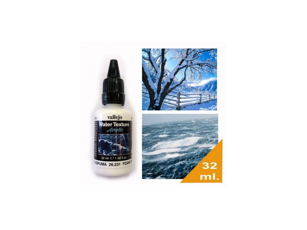 Vallejo Diorama and Water textures are a unique formulation of water-based textures designed to enhance and create realistic effects on scale models, dioramas and vignettes. The effects dry to a hard durable finish, and handles well and may be over painted. Tools and implements may be cleaned with water.